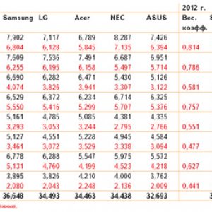 Номинация «мониторы», занимавшая два года назад седьмое место в рейтинге популярности товарных линеек, на этот раз спустилась еще на две ступеньки. Доля тех, кто продает эти устройства, в общем количестве участников опроса снизилась с 73% (в 2010 г.) до 58%. Во время кризиса этот сегмент ИТ-рынка пострадал не меньше других, а потом еще довольно долго «приходил в себя». По данным аналитической компании ITResearch, объем российского рынка мониторов по итогам 2009 г. составил 4,75 млн. шт., или 0,95 млрд. долл. Падение по сравнению с 2008 г. составило 35% в натуральных и 52% — в денежных показателях. Показатели 2010 г. более оптимистичны. По данным ITResearch, в августе 2010 г. на российском рынке было продано более 525 тыс. мониторов, что на 18% больше уровня июля. В годовом исчислении рост составил 38%. Правда, показывать положительную динамику год к году этот рынок после длительного перерыва начал только в марте 2010 г. (по сравнению с мартом 2009 г. продажи прибавили почти 21%). Тот же источник утверждает (https://www.novostiitkanala.ru/numbers/spec-numbers/detail.php?ID=64971), что спустя два года «этот рынок так и не вышел на докризисный уровень и уже вряд ли выйдет». По данным ITResearch, в 2011 г. было продано 5,62 млн. мониторов (столько же, сколько и в 2010 г.). Если же говорить о денежном выражении, то «из-за существенного снижения средневзвешенной стоимости аппаратов объем рынка в деньгах только чуть-чуть перевалил за отметку в 1 млрд. долл ... читать далее.