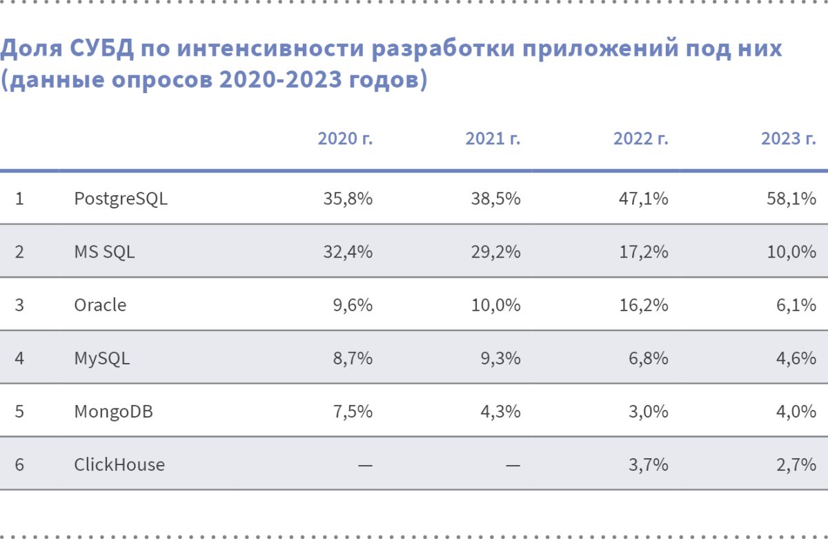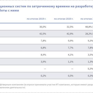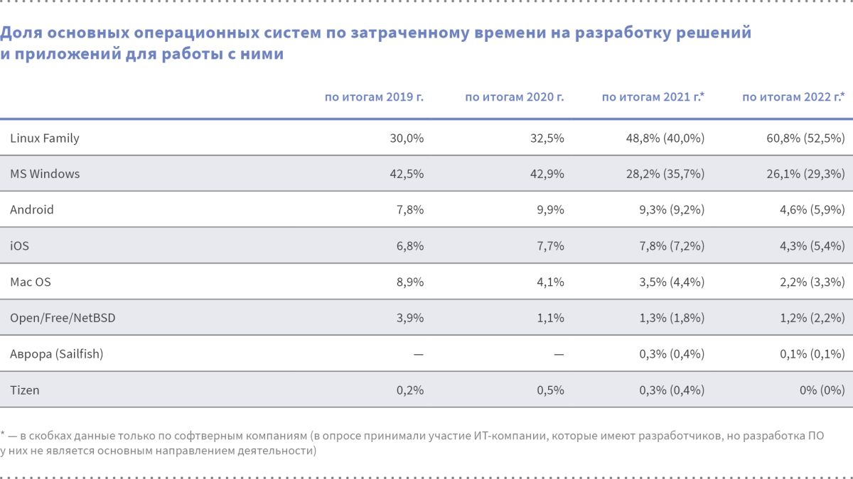 В России разработка приложений для работы с операционными системами Windows, Android, iOS, Mac OS, а также с СУБД MS SQL, Oracle и MySQL продолжает сокращаться, хотя и с разной скоростью. При этом растёт разработка приложений для работы с отечественными операционными системами на базе Linux и с системой управления базами данных PostgreSQL. Претензии на популярность в ближайшем будущем начали предъявлять и полностью российские разработки системного ПО с уникальными характеристиками. Опрос российских разработчиков ПО в рамках ежегодного исследования софтверной индустрии Ассоциации РУССОФТ показал, что, при оценке популярности операционных систем по затраченному времени на разработку решений и приложений для этих ОС, доля Windows сократилась с 28,2% в 2021 г. до 26,1% в 2022 г. Снижение хотя и незначительное за год, но оно служит продолжением тренда, начатого годом ранее, когда популярность разработки приложений для этой ОС обвалилась с 43% до 28%. К тому же, ещё более увеличилось ее отставание от Linux Family. Ещё совсем недавно — в 2019-2020 годы — Windows лидировала с большим отрывом. Но по итогам 2022 г. она стала безнадежно отставать, в то время как этот показатель у Linux Family за то же время вырос с 49% до 61%. Поскольку в 2020 г. формулировка вопроса касательно популярности ОС и СУБД изменилась, для того, чтобы увидеть динамику за 15 лет, приходится использовать ещё один показатель оценки — доля опрошенных компаний, работающих с этими конкурирующими ОС (без оценки ... читать далее.