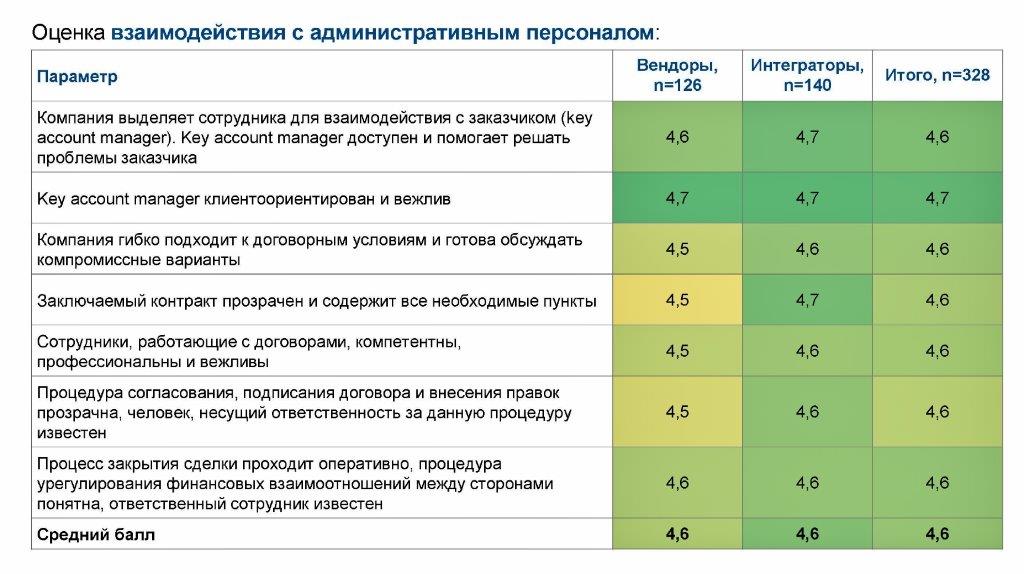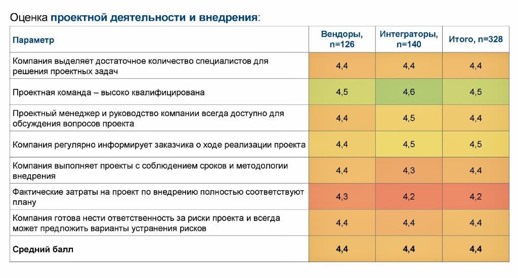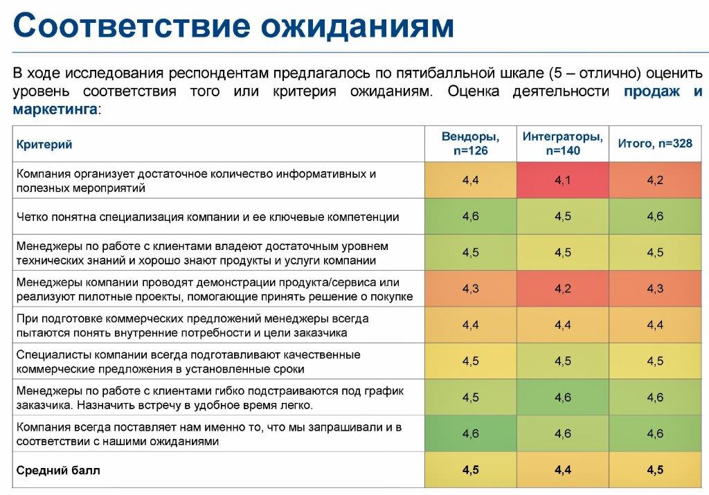 09.12.2014 Новости, Консалтинг и системная интеграция, Планирование и проекты, Рейтинги, исследованияВо время декабрьского заседания Комитета АПКИТ по мониторингу развития ИТ-индустрии были изложены основные итоги телефонного опроса ИТ-руководителей 142 отечественных компаний, машинный парк которых насчитывает 250 и более ПК. Респонденты были из самых разных отраслей: FMCG, ритейл, оптовая торговля, транспорт, логистика (28,2% опрошенных); банки и страхование (29,6%); тяжелая промышленность (машиностроение, металлургия, ГОКи, 8,5%); нефтегаз и энергетика (21,8%); телеком (2,8%); фармацевтика и химическая промышленность (9,2%). География исследования выглядела следующим образом: Москва (67,6% всех респондентов) и другие российские города (32,4%). В опросе (его проводила аналитическая компания Gartner RUS) участвовали ИТ-руководители компаний, имеющие опыт прямого взаимодействия с вендорами и/или интеграторами. Особый практический интерес представляют четыре таблицы, построенные по итогам данного исследования (его официальное название «Изучение удовлетворенности клиентов от взаимодействия с российскими ИТ компаниями»): 1) «Уровень соответствия вендоров и интеграторов ожиданиям ИТ-заказчиков в области продаж и маркетинга»; 2) «Уровень соответствия вендоров и интеграторов ожиданиям ИТ-заказчиков в области проектной деятельности и внедрения» 3) «Уровень соответствия вендоров и интеграторов ожиданиям ИТ-заказчиков в области поддержки и сопровождения» 4) «Уровень соответствия вендоров и интеграторов ожиданиям ИТ-заказчиков в области взаимодействия с административным персоналом» ...