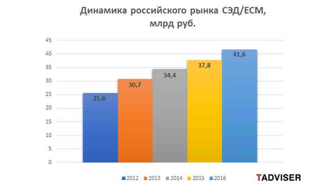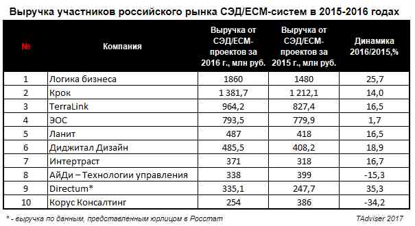 25.12.2017 Новости, Итоги и тенденции, Рейтинги, исследования, Сети и телекоммуникацииНа российском рынке СЭД/ECM-систем фиксируется положительная динамика. В 2016 году он вырос на 10%, аналогичный показатель ожидается и по итогам 2017 года. По оценке TAdviser, в 2016 году, как и годом ранее, рост российского рынка СЭД/ECM-систем составил порядка 10%, при этом его объем в рублевом выражении увеличился примерно до 41,6 млрд рублей. Говоря об итогах 2017 года участники рынка отмечали его оживление и дальнейшее движение вверх. На продолжающийся рост рынка влияет как общее восстановление экономики, так и отдельные драйверы. Для сферы СЭД/ECM — это набирающий обороты процесс импортозамещения, курс на цифровую экономику, повышение мобильности и стремительное развитие новых технологий. Большинство участников российского рынка СЭД/ECM, представленных в рейтинге ниже, по итогам 2016 года показали положительную динамику выручки от проектов в этой сфере. Только у 2 компаний из Топ-10 зафиксированы отрицательные показатели. Лидером в очередной раз стала компания «Логика бизнеса», выручка которой от СЭД/ECM-проектов выросла на 25,7% и достигла 1,86 млрд рублей. Примерно треть этой суммы пришлось на продажи лицензий, две трети — на услуги внедрения и поддержки. В тройку лидеров также попали компании «Крок» и TerraLink. Импортозамещение в тренде Рынок систем документооборота в России — устоявшийся и зрелый рынок, и изменения на нем происходят медленно, однако прошедший год принес несколько ощутимых изменений. Прежде всего, это существенное оживление в государственных ...