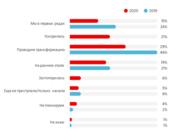 08.12.2020 НовостиОпрашивая в этом году ИТ-руководителей о технологических планах на 2021 год, Red Hat стремилась выяснить, как повлиял на эти планы COVID-19 и как компания может принести своим респондентам максимальную пользу в следующем году. И вот что узнали: цифровая трансформация и безопасность по-прежнему остаются на первых ролях, а более четверти опрошенных уже имеют гибридную стратегию облачных вычислений на 2021 год. С июля по сентябрь было опрошено более 1400 ИТ-профессионалов, в основном из компаний с годовой выручкой более 100 млн долл., причем среди них были не только клиенты Red Hat. Цифровая трансформация и безопасность по-прежнему имеют высокий приоритет Как COVID-19 повлиял на цифровую трансформацию и ИТ-приоритеты на 2021 год? Похоже, что многие компании активизировали переход на цифровые технологии, хотя некоторым, возможно, пришлось отложить цифровые преобразования в этом году. Как в вашей компании обстоят дела с цифровой трансформацией? Большинство респондентов далеко продвинулись на пути трансформации: 65% опрошенных заявили, что либо уже начали, либо находятся на последующих стадиях. В этом году Red Hat добавила такие варианты ответов, как «застопорились» и «ускорились». В результате, выяснили, что 21% организаций, похоже, активизируют усилия в этом направлении, а «застопорились» только 6% опрошенных. Хотя в этом году вдвое больше респондентов (4% против 2% в 2019 году) ответили, что у них вообще нет планов цифровой трансформации. И лишь 5% респондентов сказали, что ...