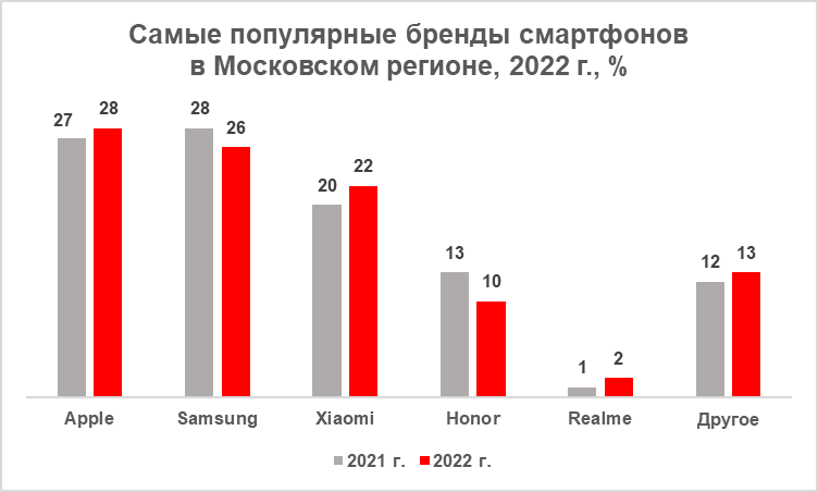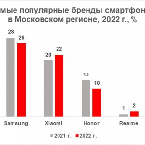06.02.2023 Новости, Рейтинги, исследования, Сети и телекоммуникацииПАО «МТС» проанализировало устройства, которыми пользуются абоненты в столичном регионе. Самым популярным брендом смартфонов среди москвичей в 2022 году стал Apple, а наиболее распространенная модель — iPhone 11. Apple впервые удалось занять первое место по количеству абонентов МТС в Москве. Айфонами пользуется каждый третий житель столицы — 28%. Ранее американская компания уступала Samsung, которая в 2022 году потеряла 2% своих пользователей и заняла второе место с долей в 26%. На третьем месте расположились смартфоны Xiaomi с долей 22%, на четвертом Honor — 10%, на пятом — Realme с 2%. В Москве самая большая доля владельцев гаджетов Apple в России. В среднем по стране iPhone использовали 18% абонентов МТС. Самыми популярными брендами смартфонов среди россиян в 2022 году были Samsung — 28% и Xiaomi — 21%. Топ-10 смартфонов, зарегистрированных в сети МТС в Московском регионе в 2022 году: Apple iPhone 11 Apple iPhone 7 Apple iPhone XR 64 Xiaomi Redmi 9A Samsung Galaxy A12 Samsung Galaxy A51 Xiaomi Redmi 9C Apple iPhone ...
