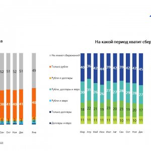 07.02.2023 Новости, Итоги и тенденции, Рейтинги, исследования, УслугиИсследовательский холдинг «Ромир» в рамках анализа влияния социально-экономической ситуации на поведение человека, выяснил, что в январе более половины россиян имели сбережения. Согласно Единой панели данных «Ромир», в январе этого года 51% россиян заявили о наличии сбережений. В их числе 40% тех, кто хранит сбережения только в рублях, 8% комбинируют несколько валют с рублями, а остальные и вовсе хранят сбережения только в иностранной валюте. На протяжение прошлых 5 месяцев (август — декабрь) доля россиян, имеющих сбережения, не превышала половины населения и находилась в диапазоне от 48% до 49%. Выросло также число тех, кому сбережений по их собственной оценке, хватит более, чем на 3 месяца — запасов на период от 3 до 6 месяцев хватит 30% россиян, от полугода до года — ...