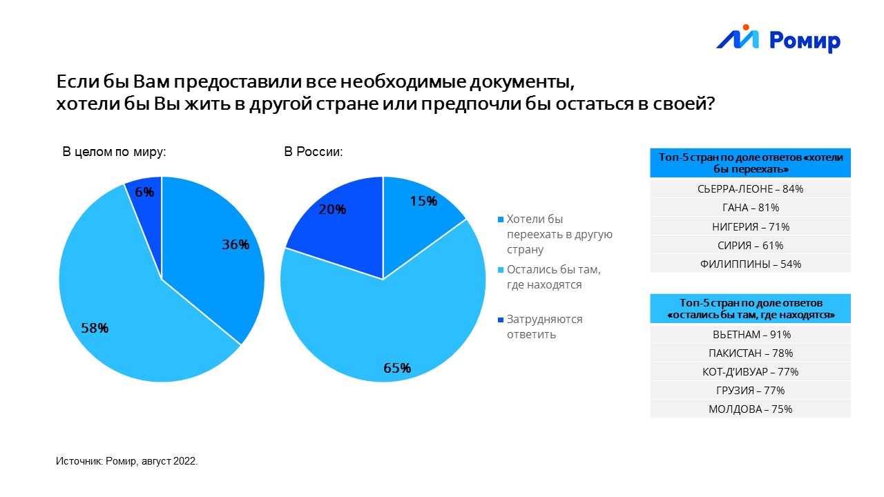 08.02.2023 Новости, Итоги и тенденции, Многопрофильные холдинги, Рейтинги, исследования, УслугиВ ходе международного исследования, проведенного Ромир/М-Холдинг в партнерстве с Ассоциацией независимых исследовательских компаний Gallup International, выяснилось, что каждый третий (36%) житель Земли готов эмигрировать. Исследование проведено в 57 странах мира. Участников исследования просили ответить на вопрос, хотели бы они переехать в другую страну, если бы у них были для этого все необходимые документы. По всему миру каждый третий респондент ответил положительно. Не хотели бы переезжать 59% землян. Среди потенциальных эмигрантов больше всего жителей стран с неблагоприятными экономическими условиями. Наибольшая готовность переехать в другую страну — в странах Африки к югу от Сахары (56%) и в Латинской Америке (54%). Самая низкая готовность к миграции отмечена в Южной Азии. Высокий эмиграционный потенциал отмечен в странах Евросоюза, однако это обусловлено в большей степени отсутствием таможенных ограничений, и происходит эта миграция в основном в пределах ЕС. Лидерами по готовности эмигрировать стали жители Сьерра-Леоне (84%), Ганы (81%) и Нигерии (71%). Наименьшая готовность отмечена среди жителей Индии (4%), Вьетнама (8%), Японии (14%). В России лишь 15% городского населения сообщили, что хотели бы перебраться в другую страну. Этот показатель один из самых низких в мире и снижается в годовой динамике. В декабре 2021 года 20% жителей России были бы готовы переехать в другую страну. Среди тех, кто хотел бы переехать в другую страну, больше всего молодых людей. Почти ...