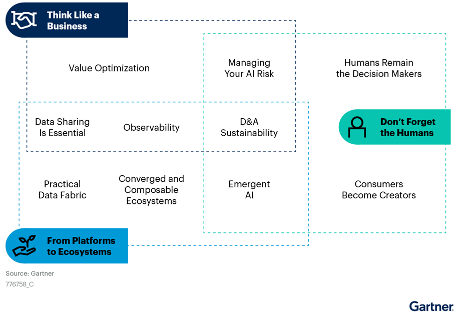 19.05.2023 Новости, Итоги и тенденции, МенеджментGartner указал десять главных трендов в обработке и анализе данных (D&A), которые помогут руководителям служб D&A создать новые источники бизнес-ценности, предвидя перемены и открывая новые бизнес-возможности в условиях крайней неопределенности. «Эти тренды в обработке и анализе данных обусловлены необходимостью приносить осязаемую бизнес-ценность в масштабе всей организации, — пишет в пресс-релизе Гарет Хершель (Gareth Herschel), вице-президент-аналитик Gartner. — Руководители служб D&A должны взаимодействовать с заинтересованными сторонами в своей организации, чтобы понять, как обеспечить принятие методов D&A. Это значит, что нужно расширять и углублять анализ и инсайты, принимая во внимание человеческую психологию и ценности». Аналитики Gartner представили десять главных трендов, которые руководителям бизнеса и ИТ-служб следует учесть и встроить в свою стратегию D&A (см. рис. 1). Рис. 1. Топ-10 трендов в обработке и анализе данных в 2023 году (метки групп): Подход с точки зрения бизнеса (черный) От платформ к экосистемам (синий) Учитывать человеческий фактор (зеленый) (тренды, сверху вниз): Оптимизация создания ценности / Управление рисками ИИ / Принятие ключевых решений остается за человеком Важность обмена данными / Наблюдаемость / Обеспечение устойчивого развития Практическая «фабрика данных» / Конвергентные и компонуемые экосистемы / Эмерджентный ИИ / Потребители становятся создателями контента 1. Оптимизация ...