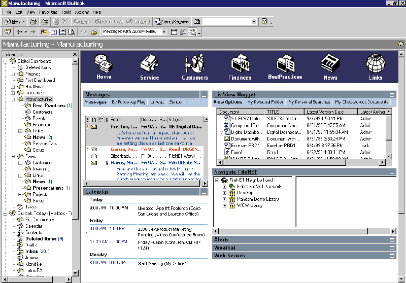 12.10.1999 Новости, Идеи и практики автоматизацииСоздавая средство доступа к бизнес-информации, производители интегрируют ПО электронной почты и управления документамиКриста Дегнан Разбросанные по экрану гиперссылки на Web-узлы уже не устраивают пользователей корпоративных порталов, и они все чаще требуют создать единое окно, в котором отражалась бы вся необходимая им информация. Всеми возможностями Panagon Dashboard корпорации FileNet можно воспользоваться прямо из окна Microsoft OutlookРазработчики программного обеспечения идут им навстречу. Корпорация FileNet, фирмы Plumtree Software и Giage независимо друг от друга предлагают продукты, в которых популярные деловые приложения, включая средства электронной почты и обработки документов, отображаются в общем унифицированном окне.В сентябре корпорация FileNet (Коста-Меса, шт. Калифорния) объявила о намерении объединить свой комплект управления документами Panagon IDM Desktop с клиентом Outlook корпорации Microsoft.“Outlook хорошо знаком многим пользователям, и интеграция с ним систем управления документами поможет пользователям легко и просто взаимодействовать с этими приложениями”, - считает Алэн Уэст, менеджер по обслуживанию клиентов страховой компании Pacific Mutual Life Insurance (Ньюпорт-Бич, шт. Калифорния). Он твердо намерен воспользоваться интеграцией Panagon с Outlook после выпуска очередной версии комплекта FileNet, запланированного на IV квартал.Интегрированное рабочее окно, которому FileNet дала название Panagon Dashboard, позволит просматривать (в ...