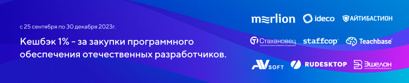 Уважаемые партнеры! Компания Merlion представляет вашему вниманию акцию по продуктам российских производителей: «Кешбэк за заказ ПО». Период действия акции: с 25 сентября по 30 декабря 2023г. Участвующие товары: все продукты от производителей «Айдеко», StaffCop, Teachbase, Стахановец, «НПО «Эшелон», RuDesktop, АВ Софт, АйТи Бастион. Основное и главное правило: закупать программное обеспечение российских производителей в Merlion. Примечание: - Начисление рибейта производится на основе объёма размещённых заказов в течение календарного квартала. - Регистрация в программе не обязательна, выплата будет производиться автоматически на баланс партнёра по итогам каждого периода. - В случае регистрации в программе сотрудник партнёра имеет возможность выбора альтернативных форм выплат: неименная банковская карта, сертификат Ситилинка. Для именного вознаграждения необходимо зарегистрироваться. За подробной ... читать далее.