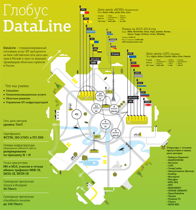 В 2011 году, по данным отчета IDC «Russia Datacenter Services Market 2011 Revenue and 2012—2016 Forecast», компания DataLine стала лидером среди московских коммерческих ЦОДов по количеству установленных и проданных стоек. DataLine — специализированный поставщик услуг ИТ-аутсорсинга на базе собственной сети дата-центров в Москве и один из ведущих облачных провайдеров в России. Компания основана в 2007 году в рамках холдинга INLINE Technologies Group. Мы активно развиваем сеть дата-центров: расширяем текущие локации, открываем новые машинные залы, наращиваем инфраструктуру. Свои ЦОДы мы строим в соответствии с уровнем надежности Tier3 по классификации Uptime Institute: электроснабжение наших площадок (электрические вводы, ИБП) зарезервировано по схеме 2n, кондиционеры и дизель-генераторы — по схеме N+1. Сетевая инфраструктура резервируется по схеме 2n. Компания ежегодно проходит сертификацию по стандартам PCI DSS и ISO 27001. Сегодня сеть дата-центров DataLine включает в себя локации OST на Боровой улице и NORD на Коровинском шоссе (Москва). Суммарная площадь сети ЦОДов составляет 5711 м2, общее количество стоек — 1277, а общая установленная мощность — 14,1 МВ·А. На сегодняшний день установлена (продана) 1191 коммерческая стойка. К 2015 году в рамках локации NORD будет построено два новых дата-центра на три и восемь машинных залов. В результате общая площадь наших ЦОДов составит ... читать далее.