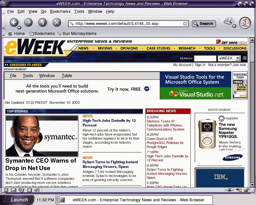 23.03.2004 МненияОБЗОРЫПакет с открытым кодом вторгается в область корпоративных настольных системВыпущенный в декабре комплект программ JDS (Java Desktop System - Java-система для настольных компьютеров), в котором Sun Microsystems объединила Linux, Mozilla, GNOME и StarOffice, представил серьезную конкуренцию связке Microsoft Windows и Microsoft Office на рынке корпоративных настольных систем.Проведенное в eWeek Labs тестирование окончательной версии JDS (ранее известной под названием Mad Hatter) наглядно продемонстрировало ее доступность и функциональность. К тому же, как оказалось, Sun предусмотрела ряд приятных мелочей, очень сильно приближающих этот продукт по его свойствам к среде Windows. Вверху: в Java Desktop System включен разработанный фирмой SuSE отличный инструментарий конфигурации YaST2, на котором красуется фирменная марка Sun. Внизу: в JDS пользователь найдет браузер Mozilla 1.4 и ряд подключаемых элементов вроде проигрывателя Flash и виртуальной Java-машины SunПравда, нельзя забывать, что перед нами - лишь начальная версия с номером 1.0, поэтому подходить к ней нужно с осторожностью. Но и она ушла очень далеко вперед даже от заказных программных продуктов. Все входящие в JDS компоненты уже доказали свою состоятельность, а вот насколько удачным дистрибьютором Linux станет Sun, покажет только время. Во многом это будет зависеть от того, сможет ли фирма оперативно инкорпорировать в свой дистрибутив программные заплаты и обновления, предлагаемые сообществом открытых кодов.Sun ...