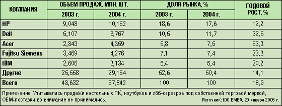 01.02.2005 МненияРезультаты только что представленного исследования IDC (www.idc.com), посвященного предварительным итогам развития рынка ПК в регионе ЕМЕА (Европа, Ближний Восток и Африка) в 2004 г., свидетельствуют о хороших показателях роста (18,9%) и сокращении отрыва лидера - компании НР - от ближайших преследователей в лице Dell, Acer и Fujitsu Siemens (см. таблицу).Аналитики отмечают, что настольные системы все еще доминируют на рынке с более чем 60%-ной долей, но темп роста их продаж снижается (в 2004-м он был чуть выше 10%). Причиной тому служит набирающая обороты переориентация покупателей из потребительского сегмента и сектора малого и среднего бизнеса на портативные компьютеры (поставки этой техники могли бы вырасти еще больше, если бы не дефицит новых недорогих процессоров Celeron M). Тем не менее настольные ПК по-прежнему активно приобретают корпоративные заказчики, осуществляющие апгрейд своей ИТ-инфраструктуры. А в потребительском сегменте растет популярность развлекательных настольных мультимедиа-центров, обладающих по сравнению с ноутбуками рядом функциональных преимуществ.С географической точки зрения большинство стран Западной Европы продемонстрировали в 2004 г. устойчивый рост на уровне 15%. В регионе Восточной Европы, Ближнего Востока и Африки быстрее других развивались рынки России, Турции и ЮАР. Весь этот субрегион рос со средней скоростью более 20%.Эксперты IDC отмечают, что катализаторами роста в 2004 г. в ЕМЕА стали бум сегмента ноутбуков и восстановление ...