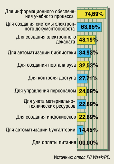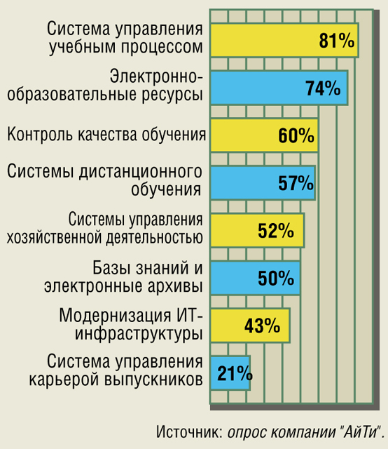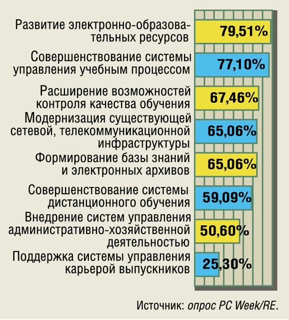 26.03.2009 Обзоры, Здравоохранение, образование, культура, МенеджментПостулат о том, что система отечественного высшего образования нуждается в серьезном реформировании и радикальном обновлении материально-технической базы, стал общим местом уже много лет назад. В какой-то момент необходимость в преобразованиях назрела столь остро, что в условиях благоприятной экономической ситуации процесс очевидно сдвинулся с мертвой точки. Условно его можно разделить на три составляющие: государственные реформы (перевод вузов на двухуровневую систему подготовки студентов, внедрение новых образовательных стандартов, перераспределение бюджетных мест в пользу более востребованных профессий и т. д.), частные инициативы университетов (развитие дистанционного обучения, партнерство с бизнесом, закупка современного оборудования на собственные средства и пр.) и модернизация “на встречных курсах”, когда государство выделяет бюджетные средства под конкретные инициативные проекты вузов. Информационные технологии здесь играют особую роль. Во-первых, Минобрнауки признало, что в стране действительно имеется острая нехватка профильных специалистов, поэтому именно в пользу айтишников (наряду с машиностроителями, агрономами и пр.) будут сокращены бюджетные места юристов и экономистов. А во-вторых, без информатизации учебного и административного процессов на современном этапе развития не может обойтись практически ни одно учебное заведение вне зависимости от его профиля. Объективной комплексной оценки того, насколько успешно происходит внедрение ИТ в систему ...
